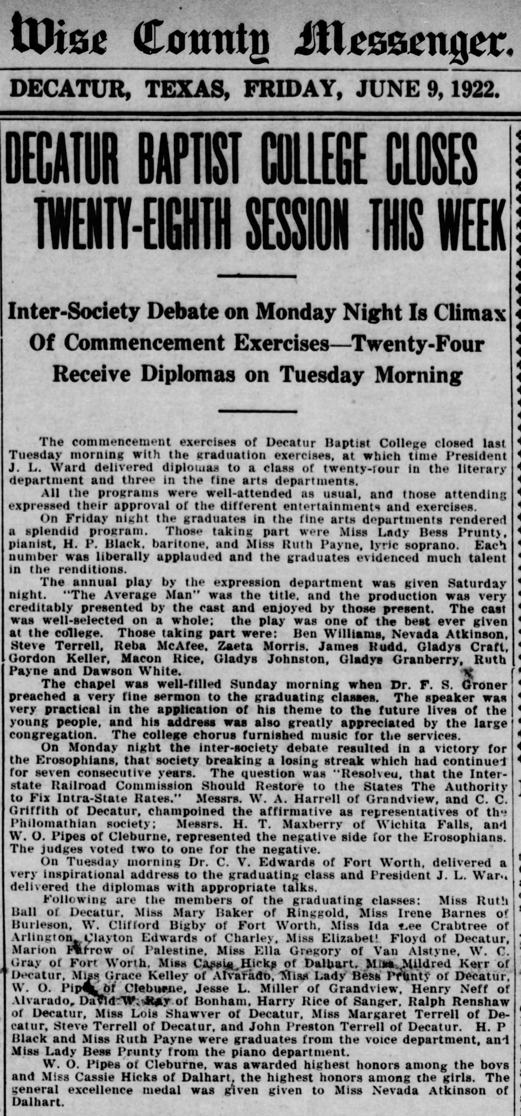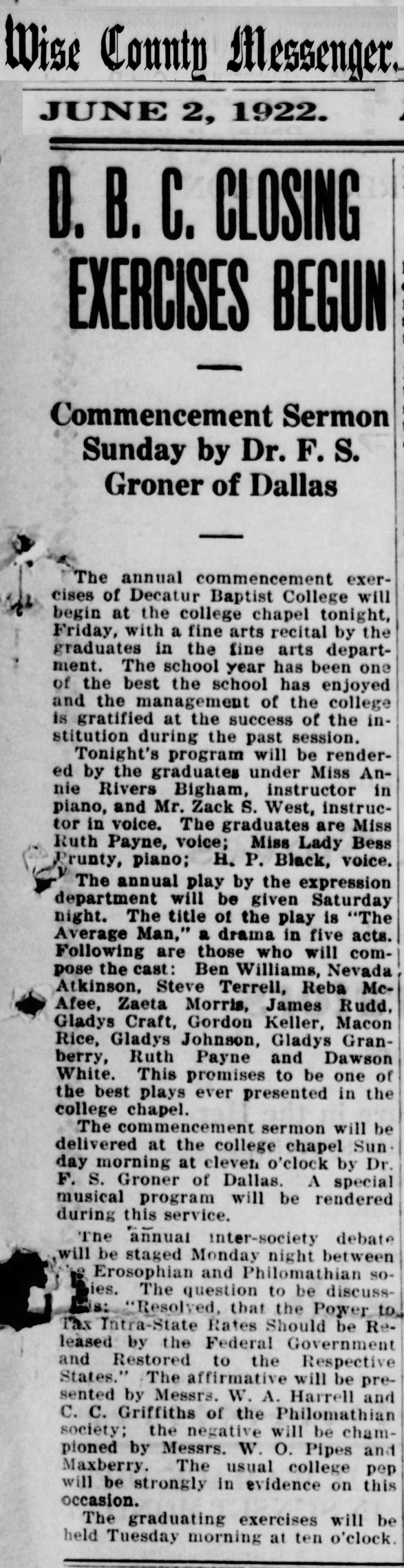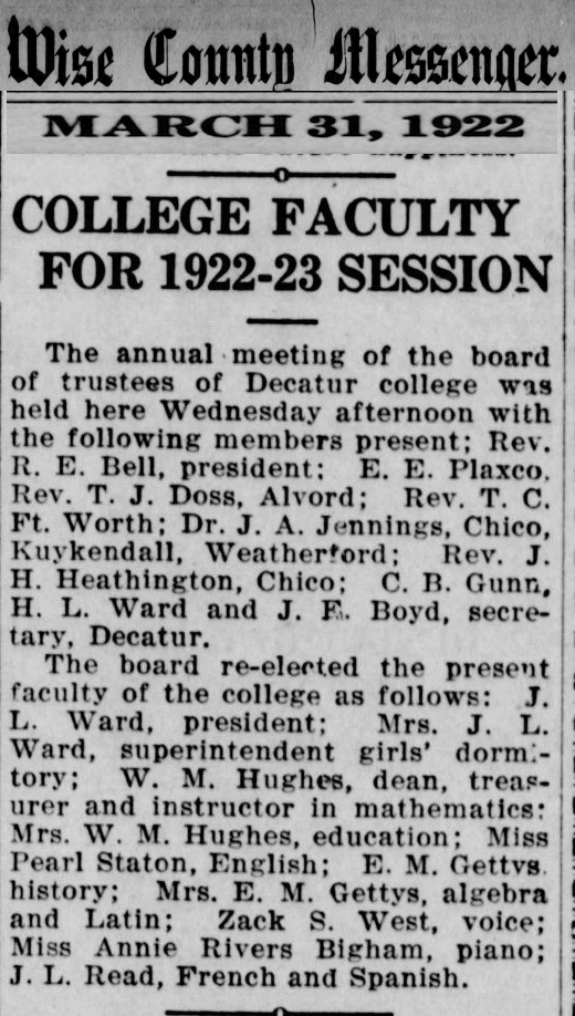 Below are some images of newspaper clippings about the Decatur Baptist College. These images came from microfilm that is available at the Wise County Heritage Museum Only a few articles are represented. Clippings that mentioned only a few names of students attending the school were not included.